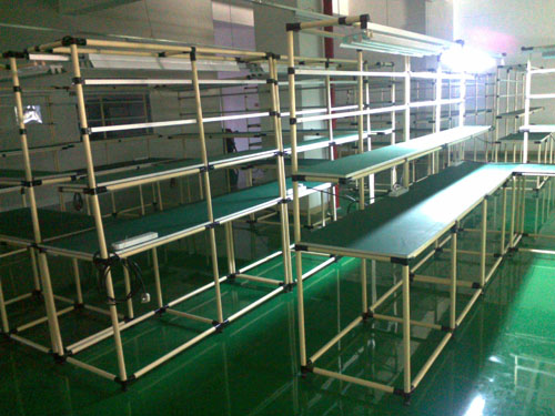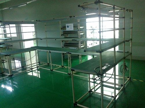 皮帶:寬度自定,綠色防靜電,采用無縫熱熔接駁;承托采用Φ25鍍鋅滾筒,上層間隔250mm一條,下層間隔2m一條。