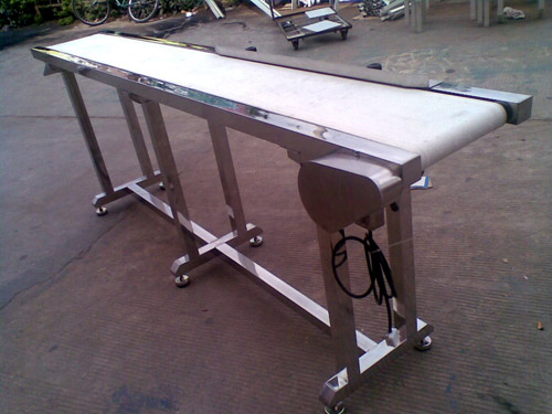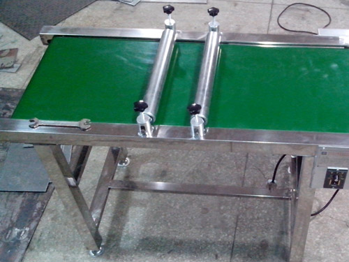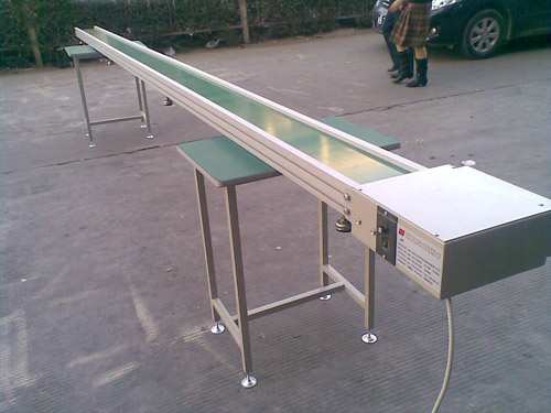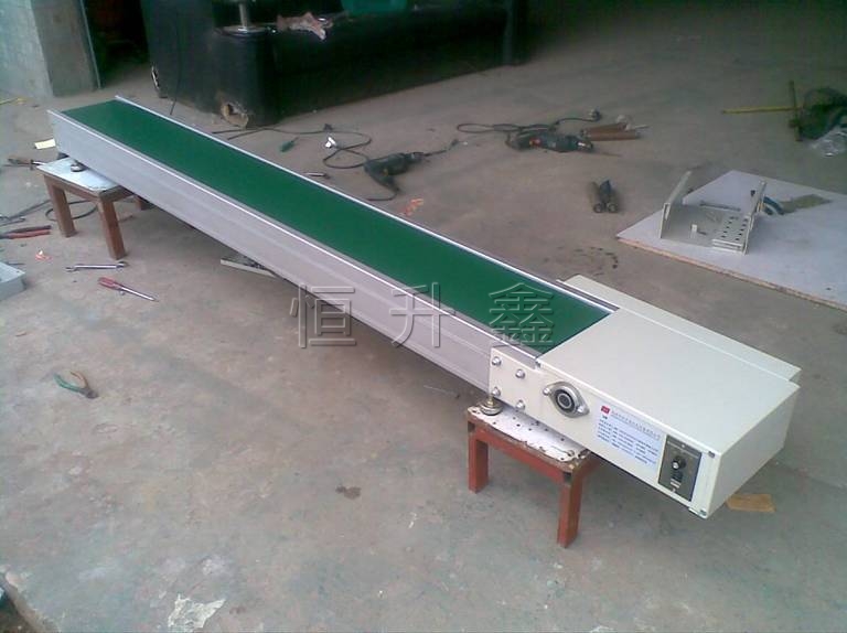 輸送:采用綠色防靜電皮帶輸送,無縫熱熔接駁成環(huán)形,寬度自定;承托采用Φ25鍍鋅帶軸承滾筒,間隔250mm一條。